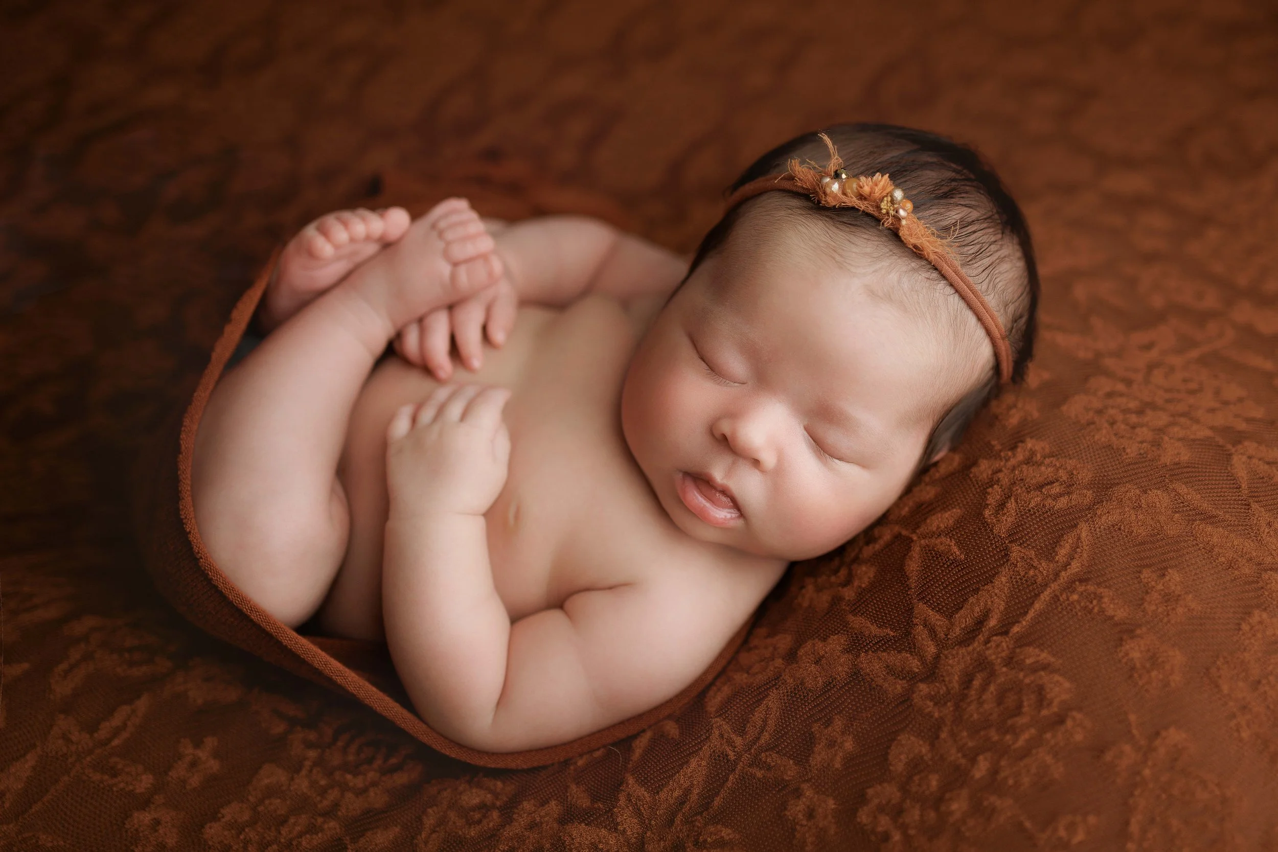 The warm tones of fall—the deep oranges, soft rusts, golden yellows, and cozy browns—create the perfect backdrop for newborn photography. These colors naturally complement a baby’s delicate skin, adding warmth and softness to every image. The contrast of those vibrant yet muted hues highlights the baby's tiny features, making each photo feel intimate and timeless.